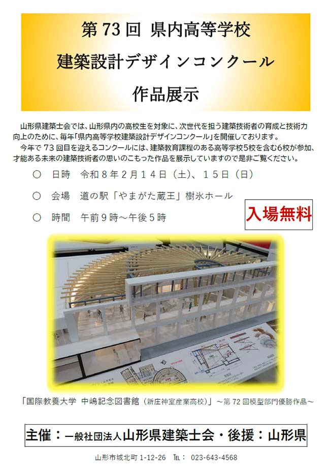 山形県建築士会では、山形県内の高校生を対象に、次世代を担う建築技術者の育成と技術力向上のために、毎年「県内高等学校建築設計デザインコンクール」を開催しております。